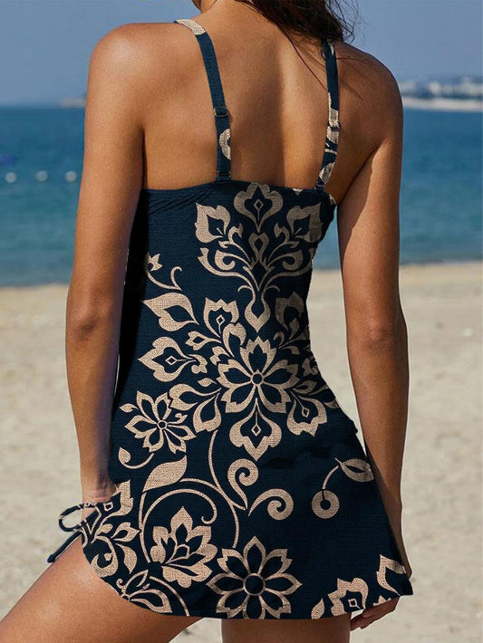 Retro Flower Print Pleated Drawstring V Neck Two Piece Tankini